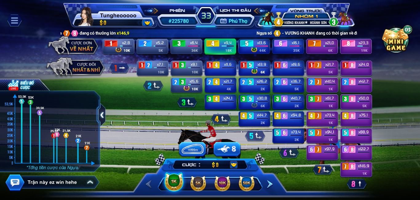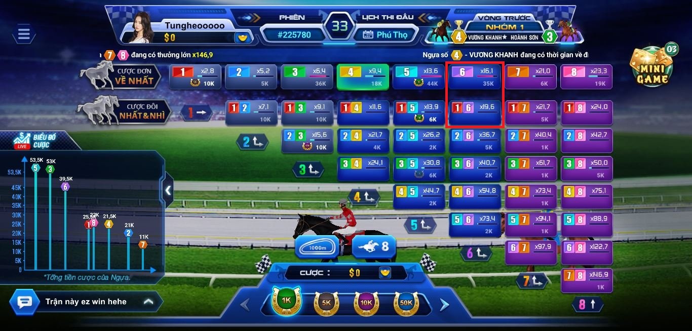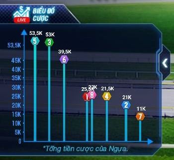 Giả sử bạn là người may mắn tham gia phiên đua ngựa này, lựa chọn phỉnh cược 10K vào chú ngựa Trung Phong số hiệu 6 (Cược đơn). Thì bạn có thể thấy tỷ lệ cược thể hiện x15.1 với mức cược tối đa hiện tại là 35K. Trong trường hợp này, bạn sẽ thắng cược được 10K x 15.1 = 151K với tỷ lệ cược thể hiện trong phiên cược này.