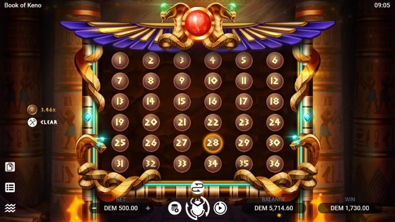 Trong game Book of Keno, người chơi sẽ tham gia một nhiệm vụ bí ẩn, hoàn thành nó để có được sự giàu sang phú quý. Có 36 ô số xuất hiện trên màn hình, nhiệm vụ của người chơi là lựa chọn 1 ô số may mắn và quay thưởng, nếu quay đúng vào ô số bạn chọn thì ăn tiền. Số tiền thưởng sẽ được tính theo công thức: [Tiền thưởng] = [Mức cược] x [3.46]