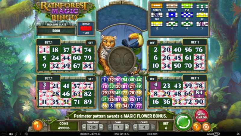 Game Rainforest Magic Bingo được lấy cảm hứng từ tựa game slot cùng tên với phong cảnh đẹp mắt, dễ chịu cho người chơi. Trong game Rainforest Magic Bingo sẽ có 4 ô số có sẵn xuất hiện dành cho bạn. Sau khi quay, 30 quả bóng với các con số khác nhau sẽ được thả xuống. Nếu như trong 30 con số này tạo nên được các dòng thắng trong 4 ô số đã cho là người chơi sẽ được tiền thưởng. Trong trường hợp 15/30 quả bóng trùng với toàn bộ ô số nào đó, bạn sẽ được BINGO. Bạn cũng có thể mua thêm bóng để tăng cơ hội chiến thắng. Phần thưởng lớn nhất trong game có thể lên đến 1.300 lần tiền cược.