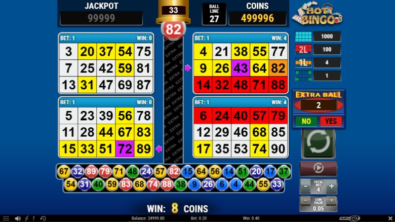 Trong game Hot Bingo sẽ có 4 ô số, mỗi ô có 15 số cho sẵn. Sau khi quay, 33 quả bóng với các con số khác nhau sẽ được thả xuống. Nếu như trong 33 con số này tạo nên được các dòng thắng trong 4 ô số đã cho là người chơi sẽ được tiền thưởng. Trong trường hợp 15/33 quả bóng trùng với toàn bộ ô số nào đó đã cho, bạn sẽ được BINGO. Bên cạnh đó người chơi có thể bỏ tiền ra mua thêm bóng để tăng cơ hội chiến thắng, tối đa 10 quả.