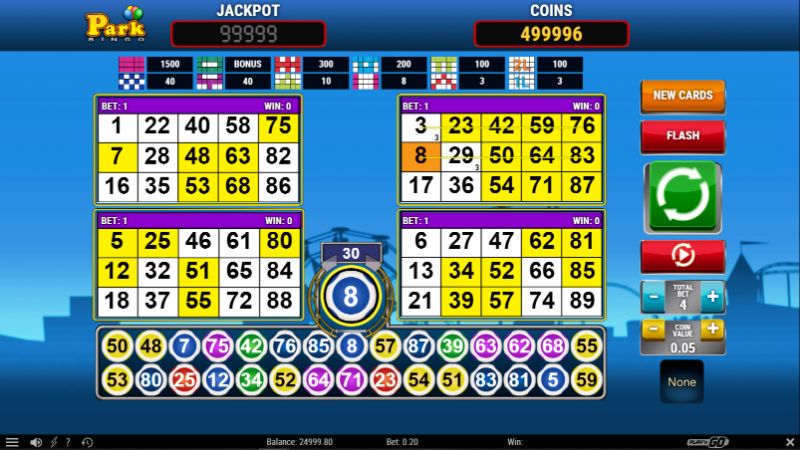 Trong game Park Bingo sẽ có 4 ô số, mỗi ô có 15 số có sẵn. Sau khi quay, 30 quả bóng với các con số khác nhau sẽ được thả xuống. Nếu như trong 30 con số này tạo nên được các dòng thắng trong 4 ô số đã cho là người chơi sẽ được tiền thưởng. Trong trường hợp 15/30 quả bóng trùng với toàn bộ ô số nào đó, bạn sẽ được BINGO. Bên cạnh đó người chơi có thể bỏ tiền ra mua thêm bóng để tăng cơ hội chiến thắng, tối đa 10 quả.