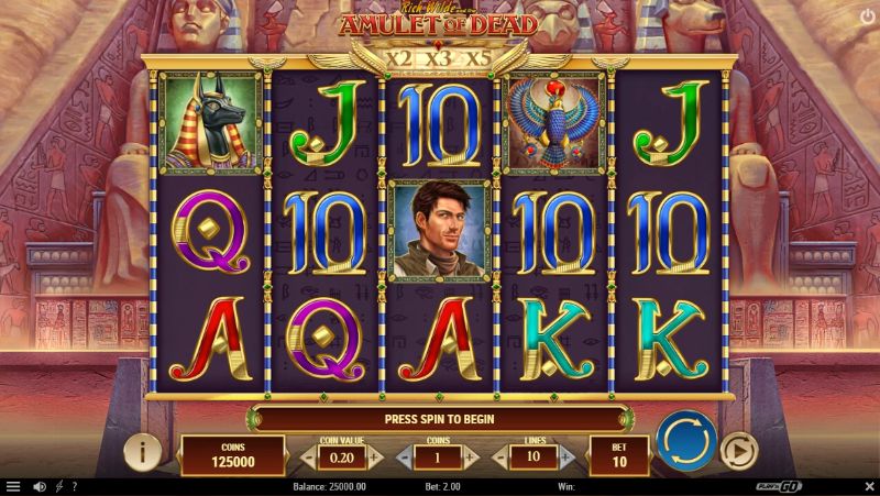 Trong game slot Rich Wilde and the Amulet of Dead, người chơi sẽ được khám phá thế giới Ai Cập cổ đại. Bảng kết quả trong game có hình dạng 3×5 (3 dòng 5 cột) với tổng cộng 10 dòng trả thưởng. Nếu ăn được 3 biểu tượng Scatter, bạn sẽ được thưởng 10 lượt quay miễn phí. Trong quá trình quay miễn phí lại được thêm 3 biểu tượng Scatter thì nhận thêm 10 lượt nữa, không giới hạn.