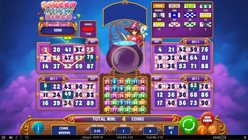 Trong game Sweet Alchemy Bingo sẽ có 4 ô số có sẵn xuất hiện dành cho bạn. Sau khi quay, 30 quả bóng với các con số khác nhau sẽ được thả xuống. Nếu như trong 30 con số này tạo nên được các dòng thắng trong 4 ô số đã cho là người chơi sẽ được tiền thưởng. Bạn cũng có thể mua thêm bóng để tăng cơ hội chiến thắng. Phần thưởng lớn nhất trong game có thể lên đến 6.625 lần tiền cược.