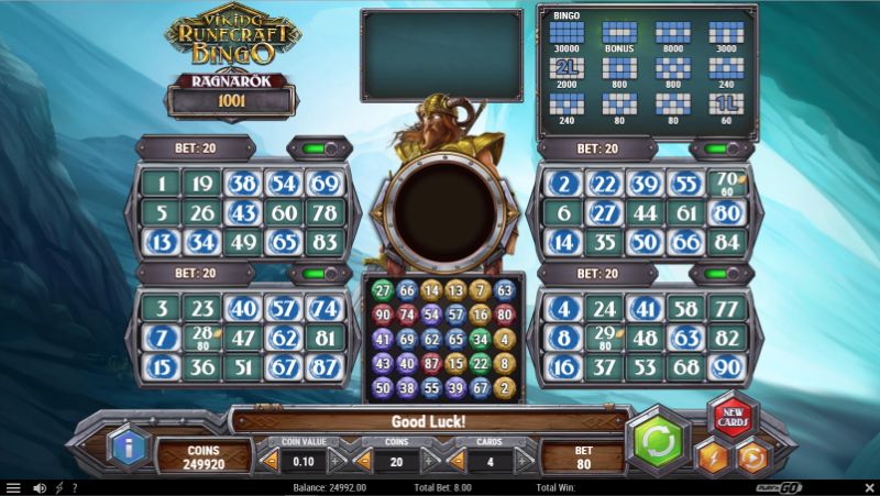 Trong game Viking Runecraft Bingo sẽ có 4 ô số có sẵn xuất hiện dành cho bạn. Sau khi quay, 30 quả bóng với các con số khác nhau sẽ được thả xuống. Nếu như trong 30 con số này tạo nên được các dòng thắng trong 4 ô số đã cho là người chơi sẽ được tiền thưởng. Bạn cũng có thể mua thêm bóng để tăng cơ hội chiến thắng. Phần thưởng lớn nhất trong game có thể lên đến 2.075 lần tiền cược.