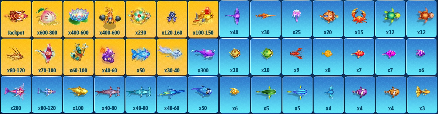 Mỗi con cá bạn săn được sẽ có hệ số khác nhau, tương ứng với tỷ lệ dưới đây. Tiền thắng cược sẽ được tính bằng cách lấy số tiền cược nhân cho hệ số cá trong bảng.